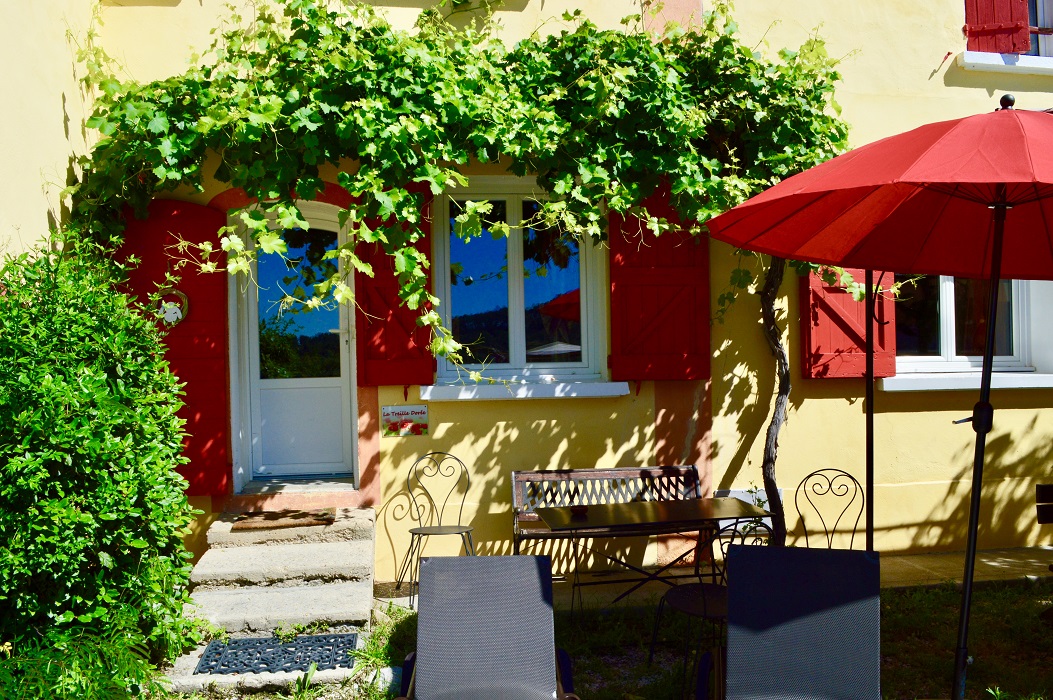 Coin plein sud avec treille en fer forgé et salon de jardin