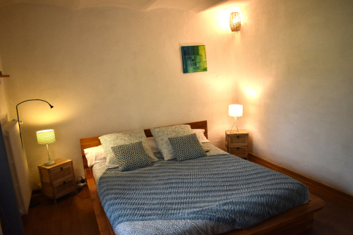 Chambre confortable avec lit double (160 cm) et moustiquaire.