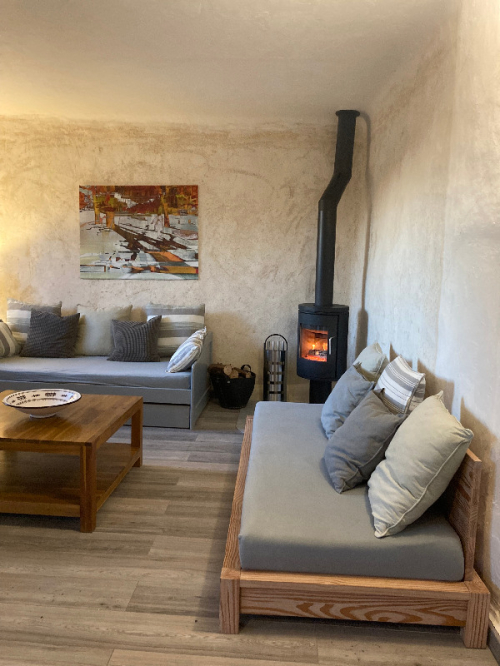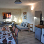 Salon avec canapé gigogne et banquette convertible, pouvant accueillir jusqu’à 3 couchages supplémentaires.