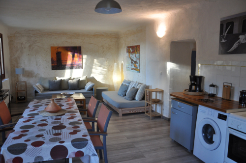 Grande pièce à vivre lumineuse avec cuisine équipée (réfrigérateur, four à gaz, cuisinière, micro-ondes, cafetière, lave-linge) et espace repas.