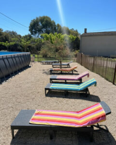 - Détente au bord de l’eau : Plongez dans votre piscine privée (ouverte en saison), véritable oasis de fraîcheur entourée de transats pour le farniente.