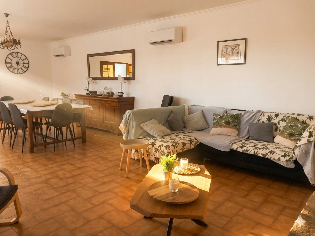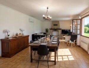 Intérieurs conviviaux : Une grande pièce à vivre pour se retrouver, une cuisine entièrement équipée pour préparer des festins collectifs, le tout dans une atmosphère climatisée et sereine.