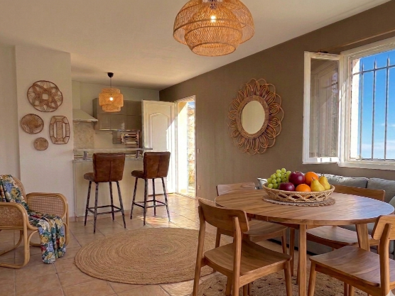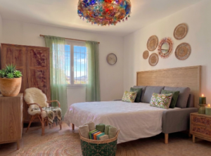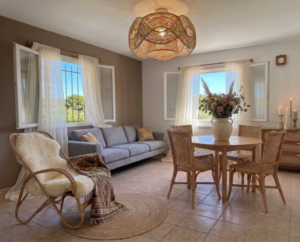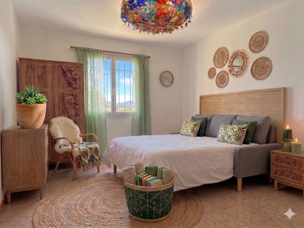 - Décoration Bohème Chic : À l'intérieur, l'atmosphère est à la fois lumineuse et cocooning. Le bois brut, le lin et le rotin créent un univers naturel en harmonie avec les oliviers.