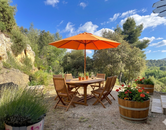 - Accès Nature Immédiat : Votre coin jardin privatif s'ouvre directement sur les sentiers de randonnée. Un pas dehors, et vous êtes déjà au cœur de la garrigue parfumée (thym, romarin, ciste).